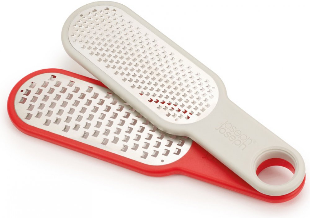 Dvě samostatná struhadla - do zásuvky se ukládají spojená klipem v madlu - JOSEPH JOSEPH Duo 20159. Hrubé nerezové struhadlo na středně tvrdý sýr a zeleninu, jemné struhadlo na tvrdé sýry (parmazán) a např. citrusovou kůru. Velikost: 23,5 x 6,5 x 2,2 cm. Výrobek lze mýt v myčce.