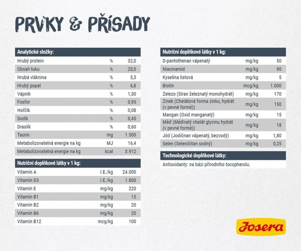 Dodatkové látky: Nutriční dodatkové látky: vitamín A (24.000 IE/kg), vitamín D3 (1.800 IE/kg), vitamín E (220 mg/kg), vitamín B1 (15 mg/kg), vitamín B2 (20 mg/kg), vitamín B6 (20 mg/kg), vitamín B12 (100 mcg/kg), niacin (90 mg/kg), kyselina pantotenová (50 mg/kg), kyselina listová (5 mg/kg), biotin (1.000 mcg/kg), taurin (1.500 mg/kg), železo [síran železnatý, monohydrát] (170 mg/kg), zinek [chelát zinku hydrát glycinu] (150 mg/kg), mangan [oxid anganatý] (15 mg/kg), měď [chelát mědi hydrát glycinu] (18 mg/kg), jód [jodičnan vápenatý] (1,80 mg/kg), selen [seleničitan sodný] (0,25 mg/kg).