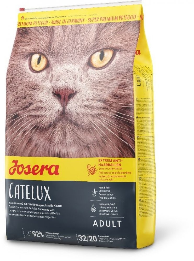 Kompletní krmivo pro kočky. Chutná strava s kachním masem a bramborami pro opravdové labužníky, pro zdravou kůži a lesknoucí se srst, speciální vlákna snižují tvorbu chlupových bezoárů. Krmivo Josera Catelux s lahodným kachním masem a bramborami. Díky vyvážené receptuře s dietními vlákny je krmivo Josera Catelux mimořádně chutné, podporuje snižování tvorby chlupových bezoárů a může mít pozitivní v...