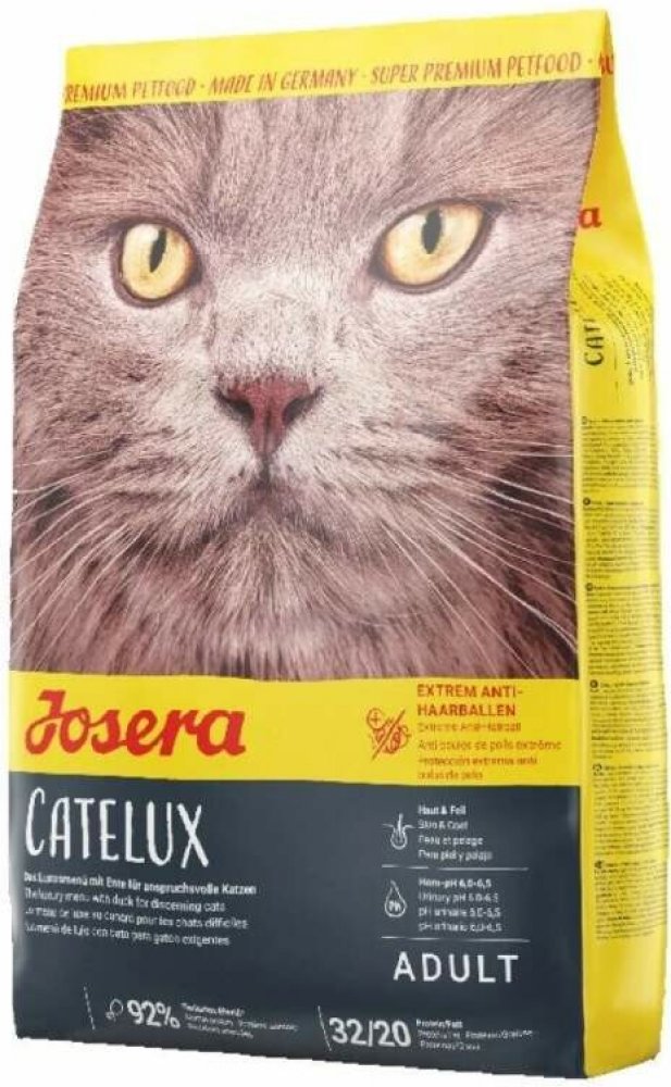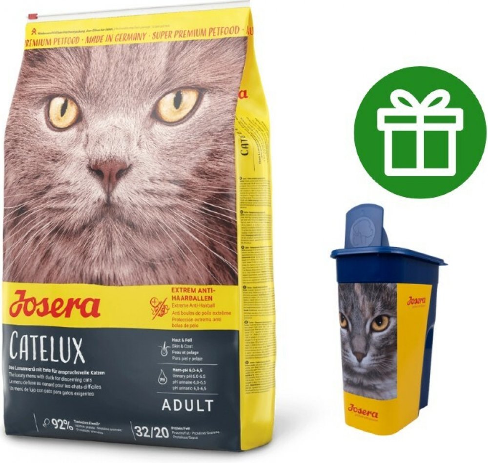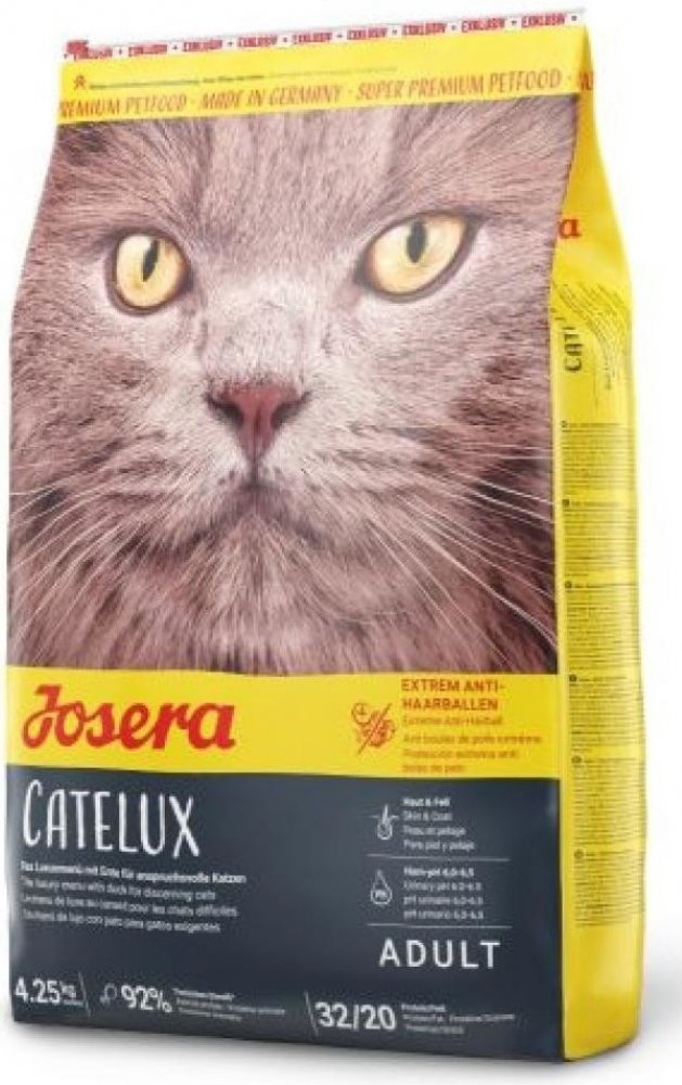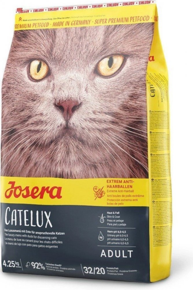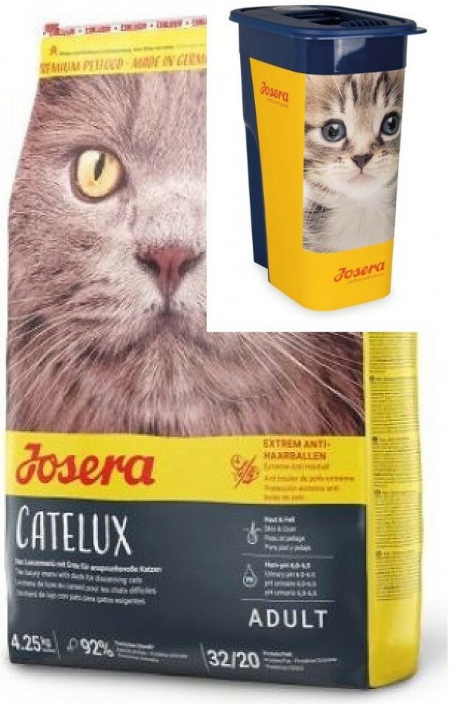 Josera Catelux v přehledu: - jdeální pro náročné kočky: lahodné kachní maso a zdravé brambory - tvorba chlupových bezoárů: především dlouhosrsté kočky spolykají při každodenní péči o srst spoustu chlupů. Speciální dietetická vlákna podporují vylučování spolykaných chlupů trávicím ústrojím a mohou snižovat tvorbu chlupových bezoárů. - kůže & srst: lesklý a hebký kožíšek stejně jako zdravá kůže jsou známky optimální výživy Vaší kočky. To zajišťují omega 3 a omega 6 mastné kyseliny, vitamín E a biotin stejně jako zinek v lehce vstřebatelné organicky vázané formě - kontrola pH: pečlivý výběr surovin zajišťuje optimální poměr vápníku a fosforu a nižší obsah hořčíku. Tím je docíleno optimálního pH v močových cestách a předchází se vzniku močových kamenů Krmivo Josera je vyrobeno a vyvinuto dle nejnovějších vědeckých poznatků v souladu s životním prostředím. Produkty Josera jsou optimálně přizpůsobené individuálním potřebám Vaší kočky.