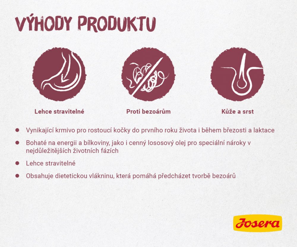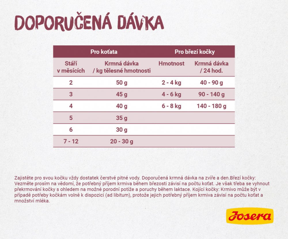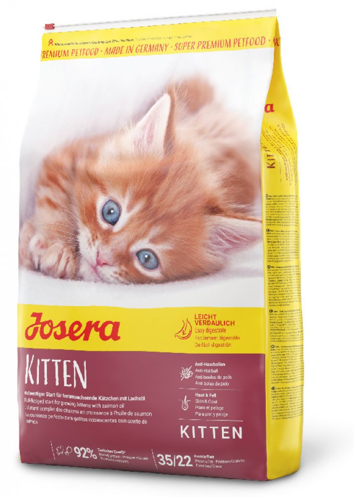 Josera Kitten 10 kg - Kompletní bezlepkové krmivo pro koťata do 12. měsíců. Vhodné i pro březí a kojící kočky. Výživa a prevence tvorby chlupových bezoárů. Balení 10 kg. - Výživné a snadno stravitelné kompletní krmivo pro koťata do 12. měsíců. Receptura bez lepku příznivě ovlivňuje trávení i vylučování. Krmivo je vhodné i pro březí a kojící kočky. Obsah omega 3 a 6 mastných kyselin působí na růst ...