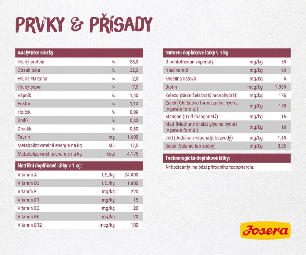 Přídatné látky: Přídatné výživové látky: Vitamín A (24.000 IE/kg), Vitamín D3 (1.800 IE/kg), Vitamín E (220 mg/kg), Vitamín B1 (15 mg/kg), Vitamín B2 (20 mg/kg), Vitamín B6 (20 mg/kg), Vitamín B12 (100 mcg/kg), kyselina pantothenová (50 mg/kg), niacin (90 mg/kg), kyselina listová (5 mg/kg), biotin (1.000 mcg/kg), železo [síran železnatý, monohydrát] (250 mg/kg), zinek [chelát zinku jako hydrát glycinu] (160 mg/kg), mangan [oxid manganičitý] (20 mg/kg), měď [chelát mědi jako hydrát glycinu] (20 mg/kg), jód [jodičnan vápenatý] (2,5 mg/kg), selen [seleničitan sodný] (0,25 mg/kg).