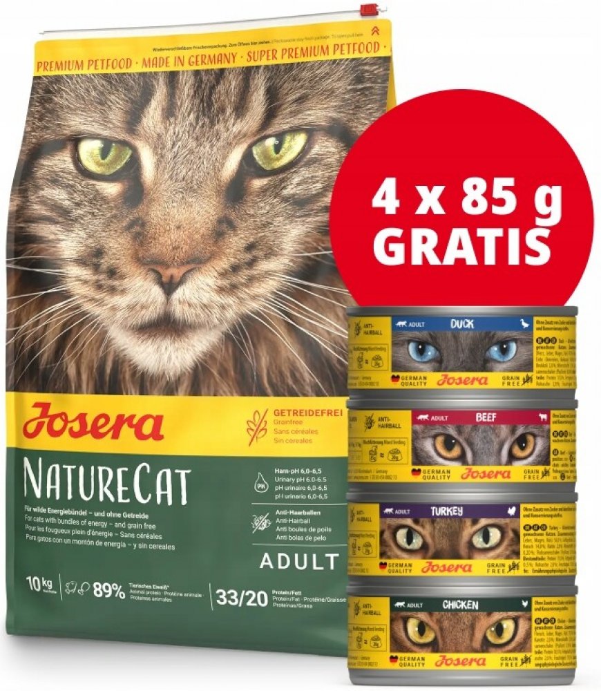 Netoleruje vaše kočka obilí a je opravdovým tygrem? Krmivo JOSERA NatureCat je opravdovou raritou pro kočky, objevitele a dobrodruhy. Bezobilné krmivo pro kočky obsahuje formuli, která je zvláště doporučena v každodenní stravě citlivých koček a koťat od 6 měsíců věku.