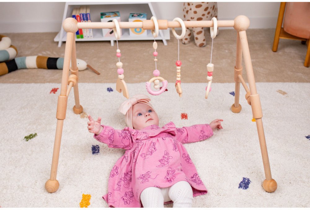 Dřevěná hrazdička POMPOM od Joybexu s hračkami ve třech barevných provedeních pro miminka již od dvou měsíců, kdy začínají pomalu zaostřovat a vytvářet spojení mezi pohybem rukou a zrakem. Je výborným způsobem, jak pomoci dětem ke správnému vývoji jemné motoriky a koordinace již od raného věku.