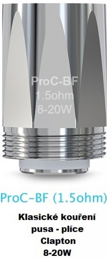 Atomizer ProC-BF o odporu 1,5ohm (8W-20W) ze 100% organické bavlny, navržený speciálně pro styl potahování ústa/plíce. Ve spolupráci s Cubis 2 clearomizerem přináší objem nádržky 3,5ml. Kompatibilní s BF (Joyetech Cubis, Cubis PRO, Cuboid Mini, eGrip II, AIO, Elitare, CUBIS 2, CuAIO D22, Cubox AIO), Green Sound GS Torpedo AIO