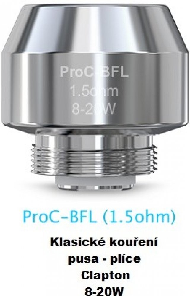 Nová generace žhavících hlav BF nese označení ProC-BFL. Využijete je jak v atomizéru CUBIS 2 ze sady CuBox, tak v e-cigaretě CuAIO. K dostání jsou celkem ve čtyřech odporech. Zatímco hlava s odporem 0,5Ω a nerezovou spirálkou je určena pro přímé potahování, žhavící hlavy s odpory 0,6Ω, 1,0Ω a 1,5Ω jsou pro potahování pusa-plíce. Poslední jmenovaná nabízí clapton spirálku.