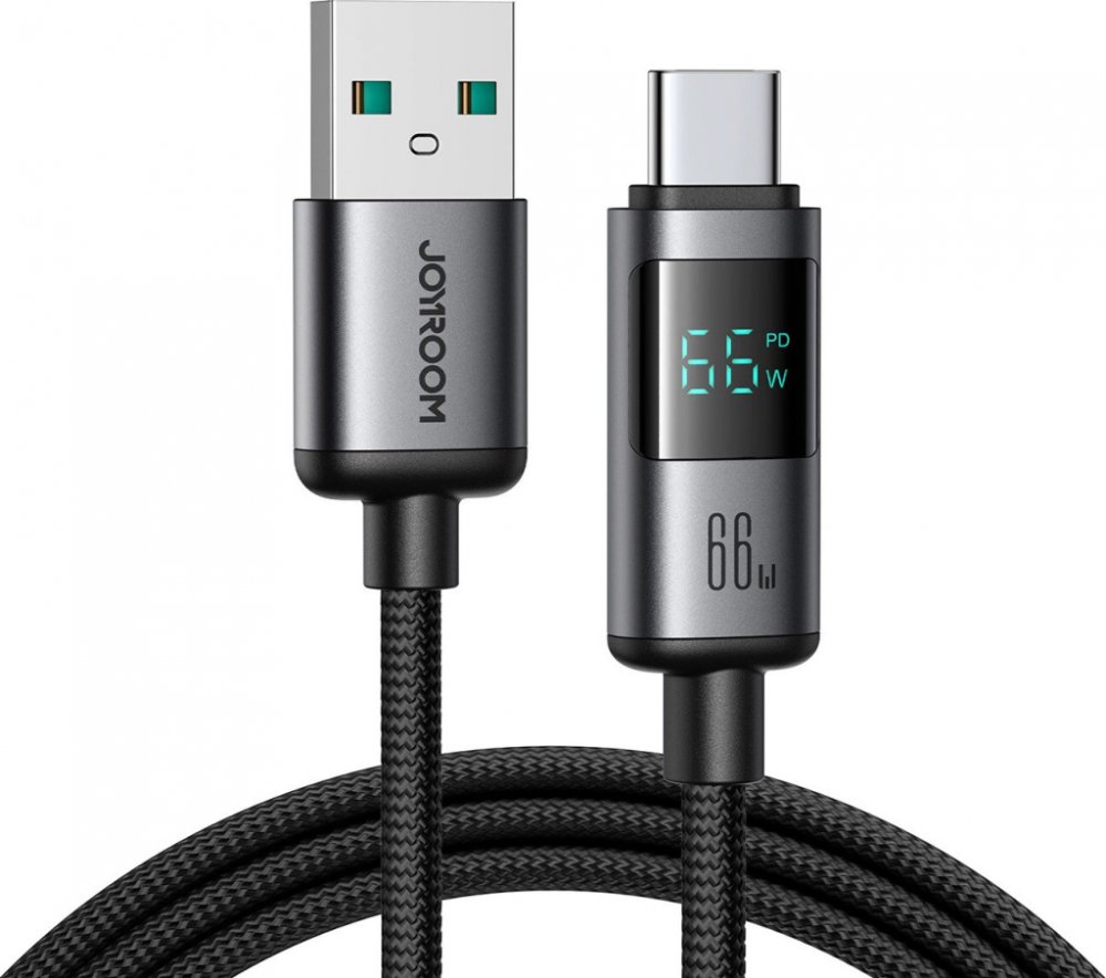 Kabel Joyroom S-A16 Pro Prism Series 66W USB-A - USB-C s displejem 1,2 m - černý Kabel Joyroom S-A16 Pro Prism Series 66W USB-A na USB-C je silné a spolehlivé příslušenství určené pro rychlé nabíjení a stabilní přenos dat. Podporuje nabíjení až do 66 W, takže je ideální pro napájení chytrých telefonů, tabletů a dalších zařízení s rychlonabíjením. Vestavěný LED displej zobrazuje výkon nabíjení v re...