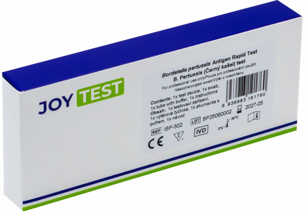 Jedinečný profesionální antigenní test určený k detekci černého kašle (Bordetella pertussis) z výtěru z nosohltanu. Výsledek do 10 minut bez nutnosti laboratorního vybavení. Tento test nemá na trhu konkurenci a je exkluzivně dostupný pouze pod značkou JOYTEST. Vyvinuto na základě dlouholetých zkušeností. Určeno pro zdravotnické profesionály.