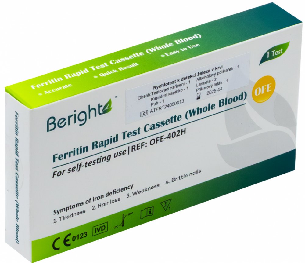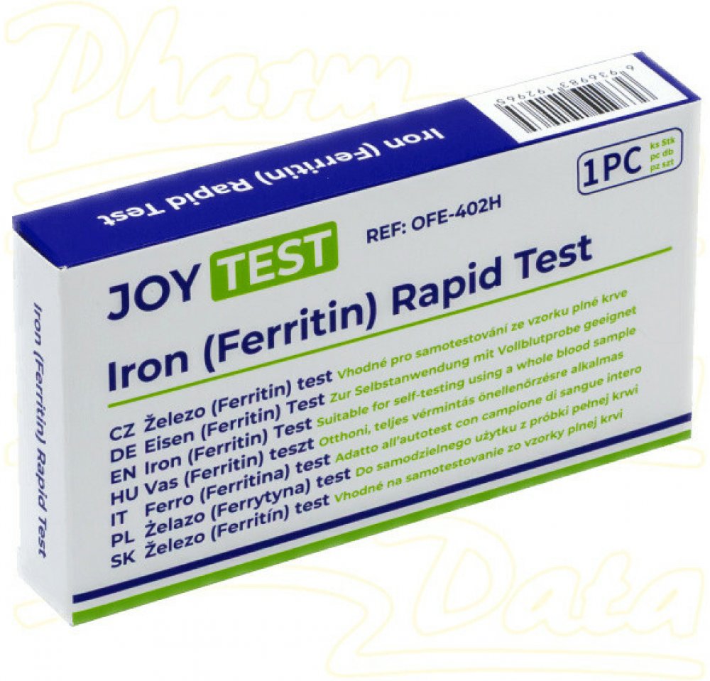 Exkluzivní rychlotest značky JOYTEST určený pro orientační stanovení nedostatku železa (feritinu) z kapky krve. Výsledek do 10 minut bez nutnosti laboratorního vybavení. Vyvinuto na základě dlouholetých zkušeností. Určeno pro domácí použití (samotestování).Detekovaný parametr: feritin – orientační stanovení hladiny železa.Typ odběru: kapka krve z prstu (kapilární odběr)Výkon testu (klinické hodnocení):Citlivost 87,5 % Specifičnost 97,4 % Přesnost 95,1 %Balení obsahuje:1× testovací kazeta1× sterilní lanceta1× kapilární kapátko1× pufr1× alkoholový tampon1× příbalový leták