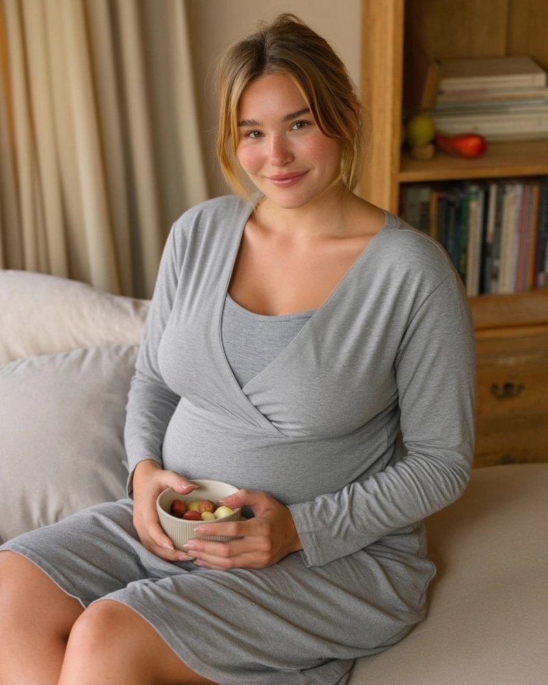 EVA je nový střih noční košile vhodné pro těhotné a kojící ženy. Eva je ušita z lehčího bavlněného úpletu ( 94% bavlny + 6% elastanu ). Tento materiál je vhodný