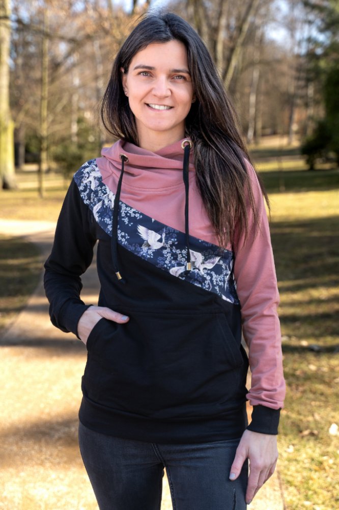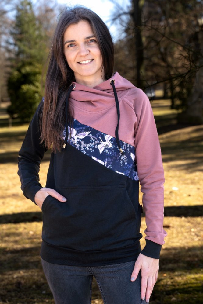 Nevšední design téhle mikiny upoutá pozornost všude, kam vejdete. Horní část ve starorůžovém odstínu dodává modelu jemnost a ženskost, šikmý šedý pruh zdobený růžovými květy a jeřáby přináší do outfitu nádech uměleckého vyjádření. Spodní černá část pak celkový look elegantně uzemňuje.