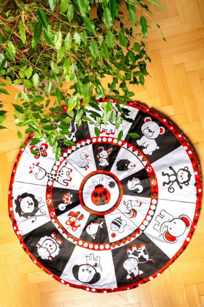 Kruhové uspořádání motivů přirozeně přitahuje pozornost miminka ke středu a postupně ho vede k objevování všech detailů – od puntíkaté berušky až po pichlavého ježečka. Červená zbarvení berušky, kopýtek, zobáčků a dalších prvků oživují černobílý design a vytváří fascinující kontrasty pro zvídavá očička.