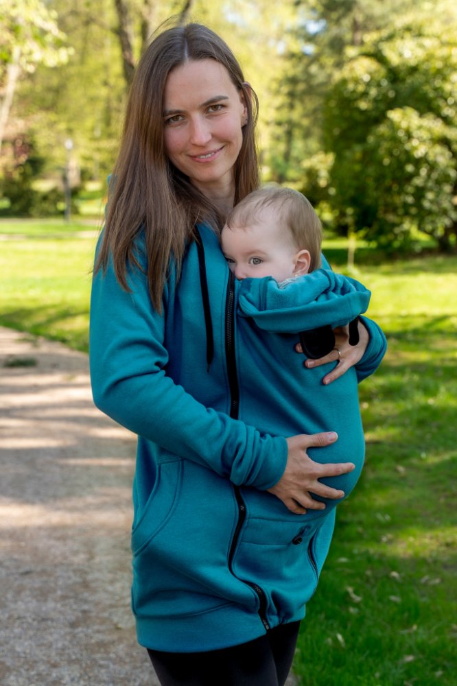Petrolejová je královnou modrozeleného spektra – a my jsme se proto rozhodli, že v tomto velepohodlném modelu dostane hlavní slovo právě ona. Jedinečný odstín inspirovaný hlubinami oceánu do outfitu vnáší šmrnc, zatímco ouška na kapucce pro miminko jsou úžasně roztomilým prvkem. Tahle mikča dokáže skvěle rozjasnit den. Nejen vám, ale i každému, koho v ní potkáte. Připravte se na obdivné pohledy a úsměvy kolemjdoucích – pokud si v tomhle kousku vyjdete ven, bude jich víc než dost!