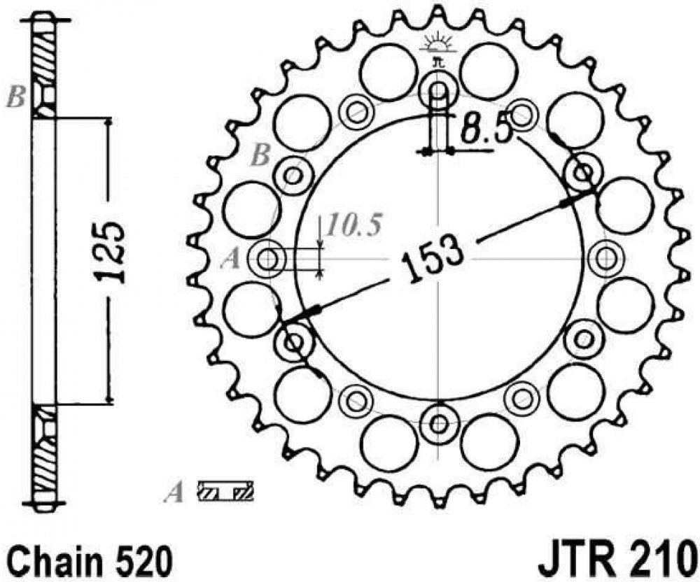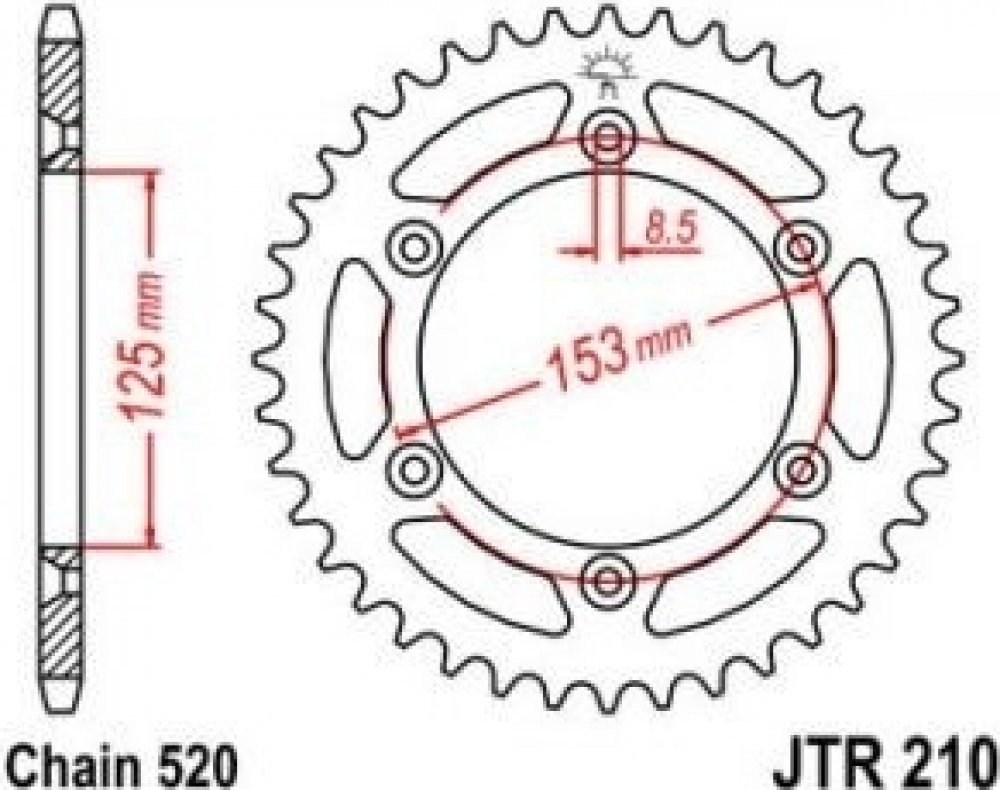 Zadní řetězová rozeta JTR210 anglického výrobce JT Sprockets na řetězy šíře 520 - řetězová kola anglického výrobce JT Sprockets vynikají vysoce kvalitním zpracováním a použitým materiálem C49 High Carbon Steel (speciální ocel). Vyrovnávají nebo překračují veškeré požadavky kladené na tyto výrobky. Speciální postup výroby zahrnující 25 výrobních kroků a 10 individuálních kontrol zaručuje nejvyšší kvalitu těchto kol. Skladem v ČR pouze kolečka pro běžně používané motocykly, ostatní na objednávku 1-8 týdnů! Určeno pro motocykly