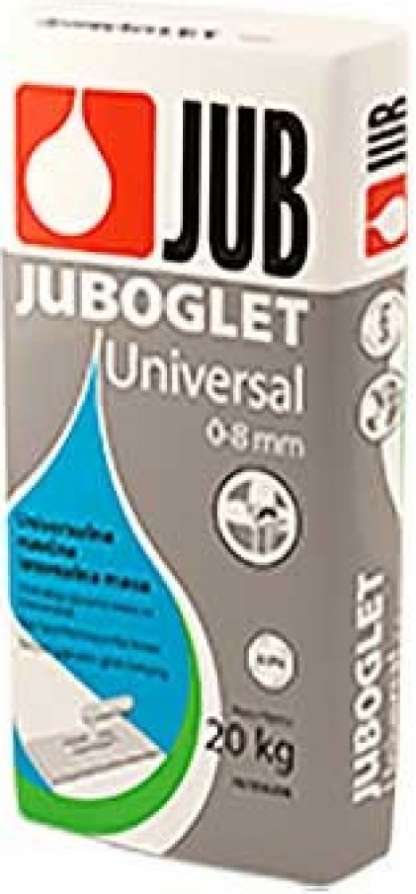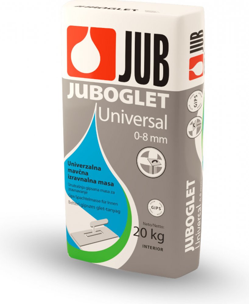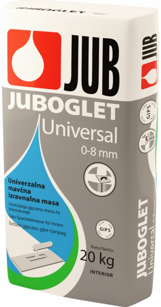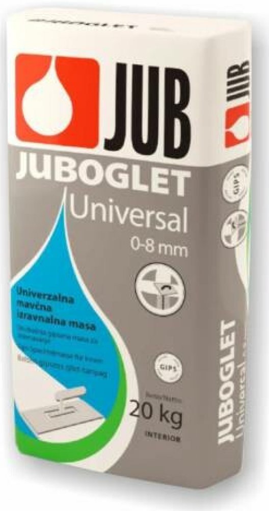Práškový stěrkový tmel na bázi sádry určený k vyrovnání vnitřních povrchů stěn a stropů v tloušťce až do 8 mm. Je vhodný na všechny druhy omítek, neomítnutý beton a ke spárování obkladů ze sádrokartonových desek. Juboglet UNIVERSAL Práškový stěrkový tmel na bázi sádry určený k vyrovnání vnitřních povrchů stěn a stropů v tloušťce až do 8 mm. Je vhodný na všechny druhy omítek, neomítnutý beton a ke spárování obkladů ze sádrokartonových desek. Podklad: pevný, suchý a čistý. Základní nátěr: vodou rozředěná AKRIL EMULZE (1 : 1). Barva: přírodní bílá. Po zaschnutí lze povrch natírat všemi druhy disperzních barev. Pro dosažení dokonalého vzhledu povrch před natíráním jemně vyrovnáme JUBOGLETEM, JUBOLINEM nebo NIVELINEM. Prohlášení o vlastnostech podle EN 13279. Tloušťka vrstvy 0–8 mm. Vydatnost 1,2 kg/m2 při tl. vrstvy 1 mm Balení 5 kg a 20 kg