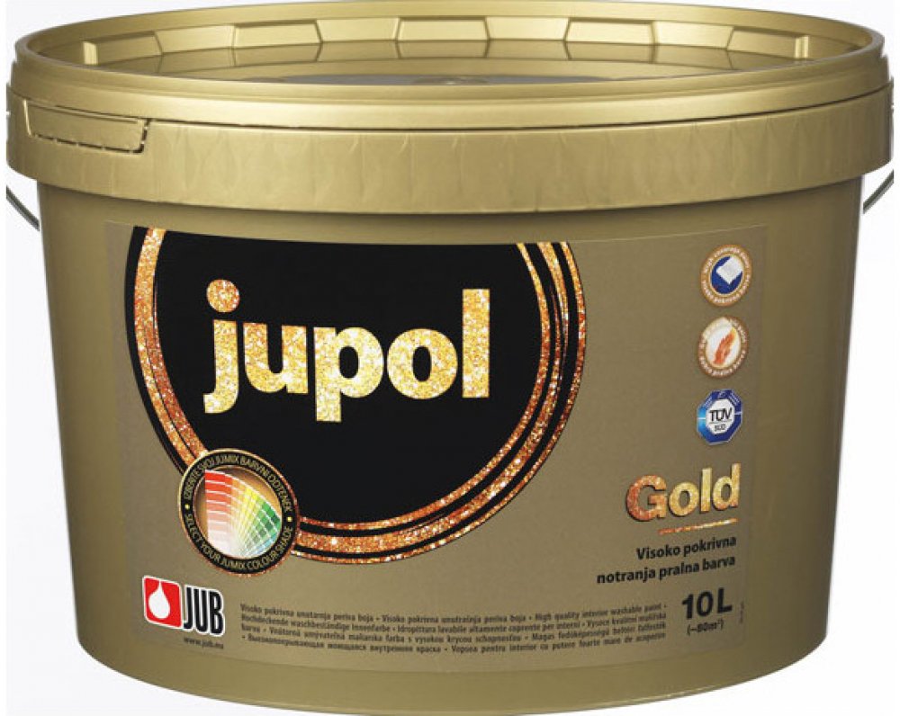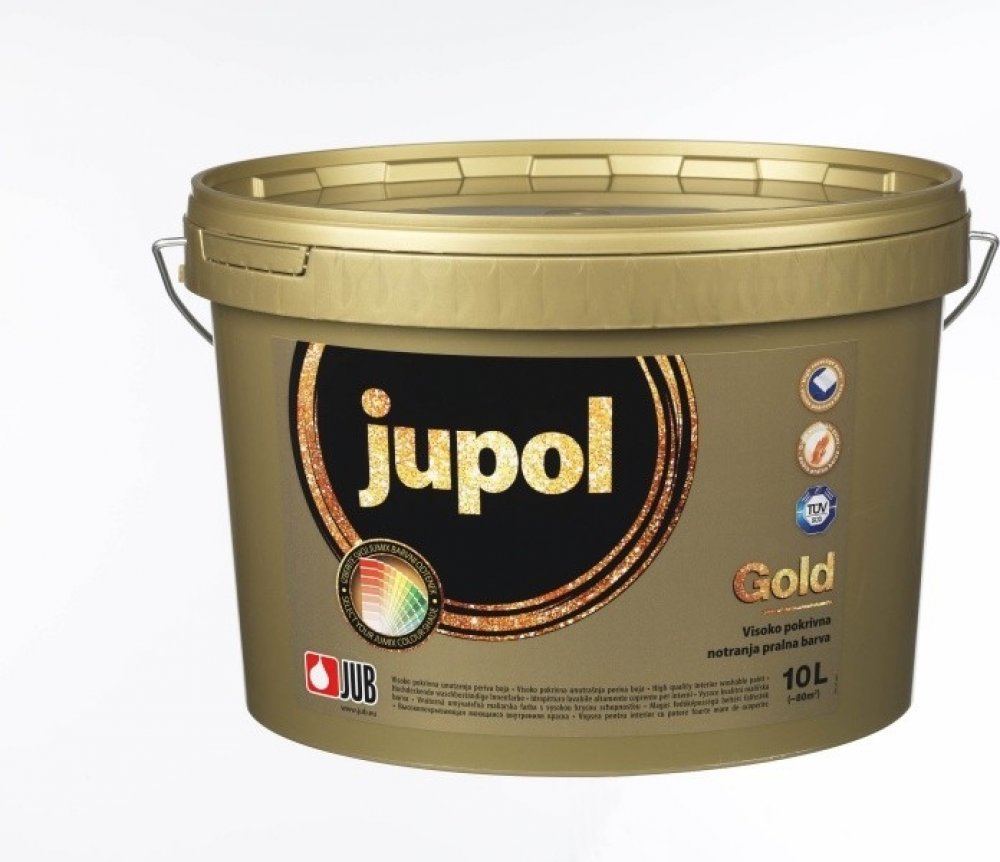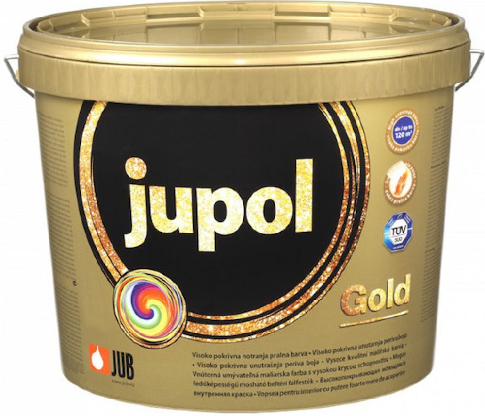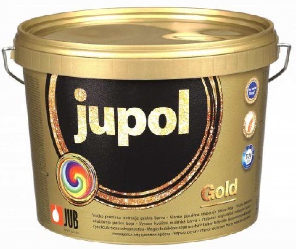 Jupol Gold je vnitřní omyvatelná malířská barva s vysokou kryvostí. Barva je šetrná k životnímu prostředí, vyrobená na základě vodní disperze polymerních pojiv. Používá se k dekorační ochraně stěn a stropů. Vhodnými podklady jsou jemné omítky všech druhů, povrchy vyrovnané vyrovnávacími hmotami, papírové a reliéfní tapety, reliéfní tapety ze skelných vláken i sádrokartonové a vláknocementové desky...