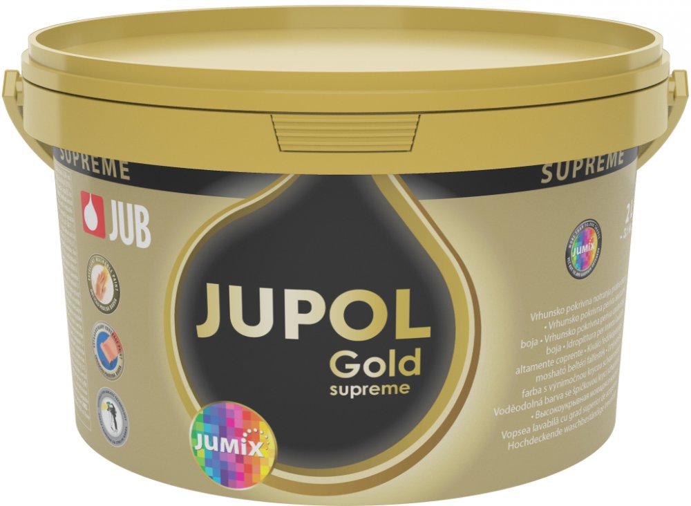 Jupol Gold je vnitřní omyvatelná malířská barva s vysokou kryvostí. Barva je šetrná k životnímu prostředí, vyrobená na základě vodní disperze polymerních pojiv. Používá se k dekorační ochraně stěn a stropů. Vhodnými podklady jsou jemné omítky všech druhů, povrchy vyrovnané vyrovnávacími hmotami, papírové a reliéfní tapety, reliéfní tapety ze skelných vláken i sádrokartonové a vláknocementové desky, dřevotřísky, neomítnutý beton a pod.Finální film je dobře paropropustný a odolný proti mokrému otěru. Nečistoty můžeme z přemalovaných povrchů umýt hadrem namočeným do roztoku běžných domácích čistících prostředků. Pro dosažení požadovaných vlastností doporučujeme aplikovat barvu alespoň ve dvou vrstvách.