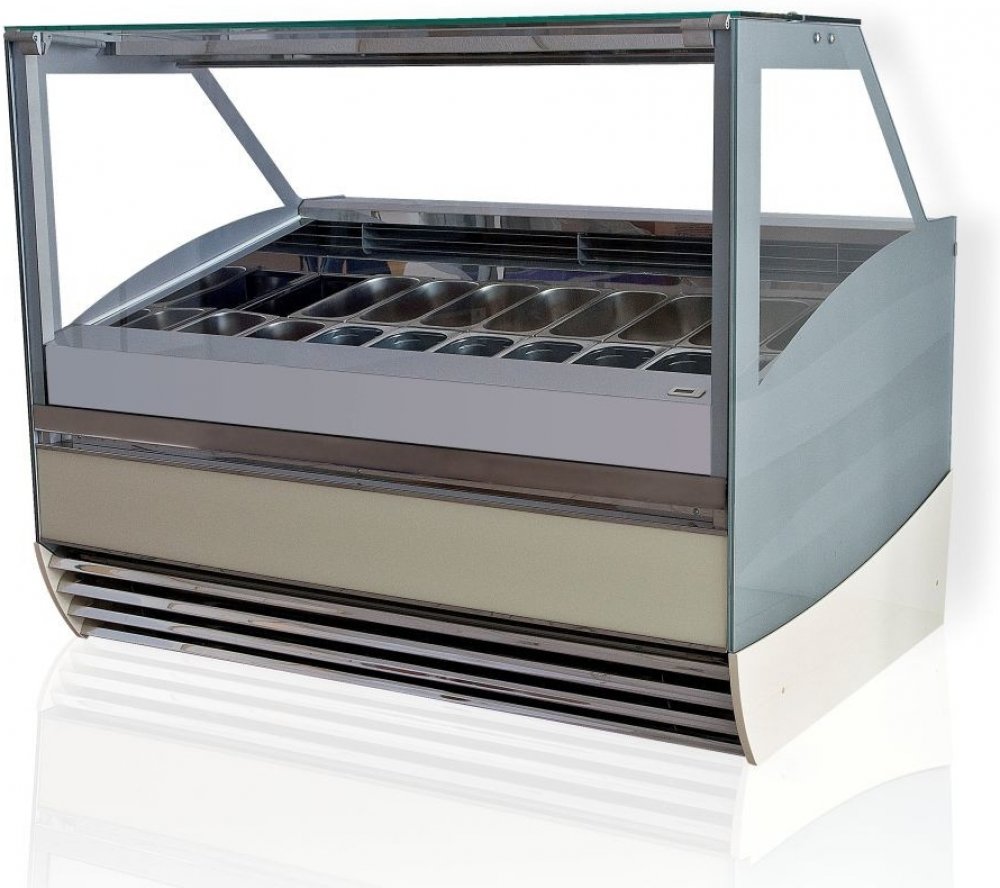 Elegantní distributor zmrzliny s kapacitou 2x6 gastronádob. Jednotný design s cukrářskou vitrínou Juka Magnum.