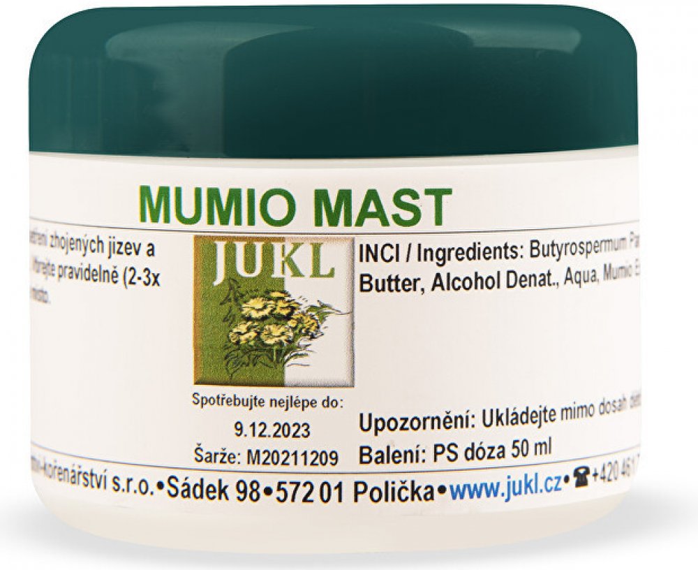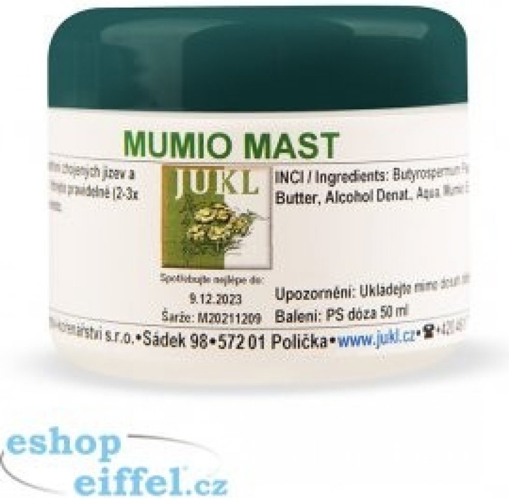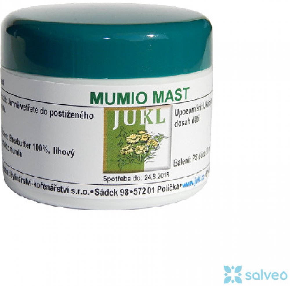 Mumio mast od značky JUKL je přírodní produkt vhodný k ošetření zhojených jizev a poškozené pokožky. Tato mast obsahuje 50 ml účinné látky a je bohatá na vitamíny E, provitamín A a D. Poskytuje účinný UV filtr a zásobuje pokožku nenasycenými mastnými kyselinami, aminokyselinami a vitamíny B, C a A.