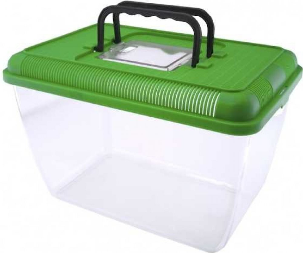 Lehký přenosný box pro terarijní zvířata, s větracími otvory ve vrchní části.