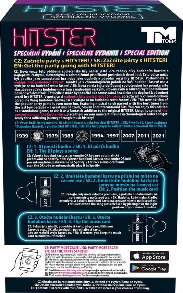 Hitster CZ/SK je pravidlově jednoduchá párty hra, ve které se budete moci blýsknout tím, jak dobře se orientujete v (nejen) české a slovenské hudbě. Hra obsahuje 130 českých a slovenských písní a 178 mezinárodních hitů z posledních 100 let. DJ naskenuje hudební kartu pomocí bezplatné aplikace a hráči se střídají v hádání data vydání, jména interpreta a názvu skladby. První hráč, který bude mít čas...