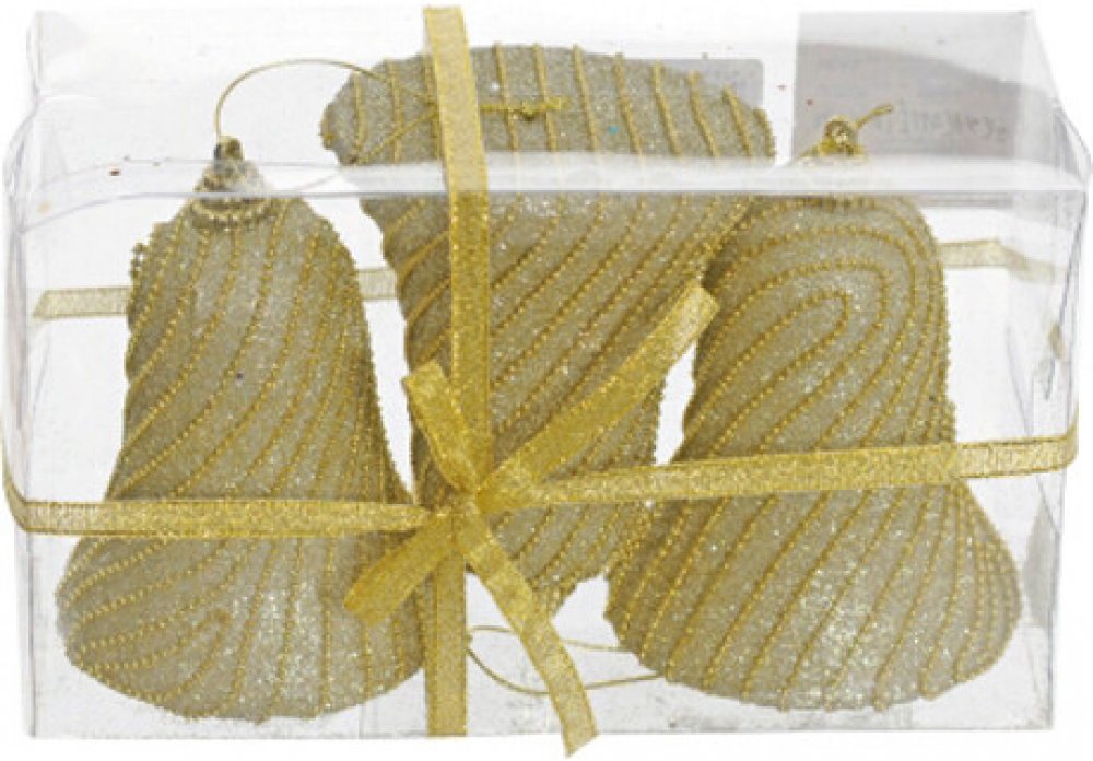 Vánoční závěsná ozdoba ve tvaru zvonku, ve zlaté barvě zdobená korálky. Sada obsahuje tři kusy. Rozměr jedné ozdoby 10x7cm.Doplňující popis:10x7 cm