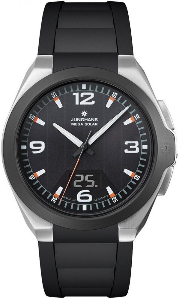 Junghans kombinované guma sportovní pánské solární pro potápění (100+ m) 41.6 mm ocel 100 m solární safírové bez osazení Spektrum Mega Solar kulaté černá černá trnová spona 2.2 cm na ruku německé s arabskými číslicemi 4.16 cm střední s dočasným svícením (luminiscence/LED) s nenáročnou údržbou (quartz)