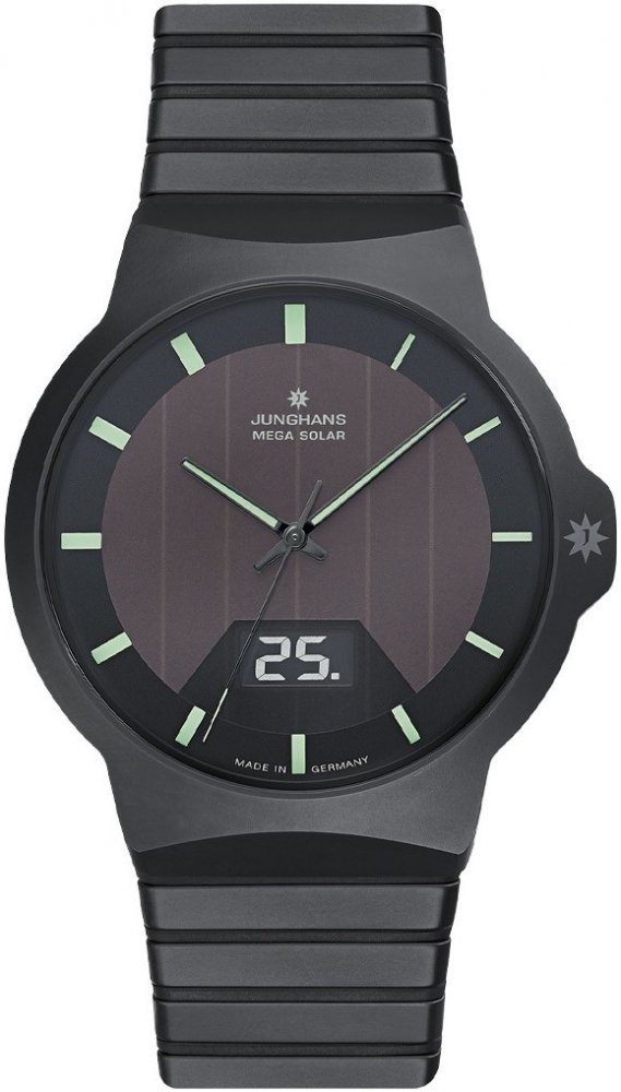 Německé hodinky Junghans Force Mega Solar 018/1938.44 z řady Performance mají kombinovaný, analogový a digitální ciferník, kde na první pohled převládá jednoduchost a přehlednost.