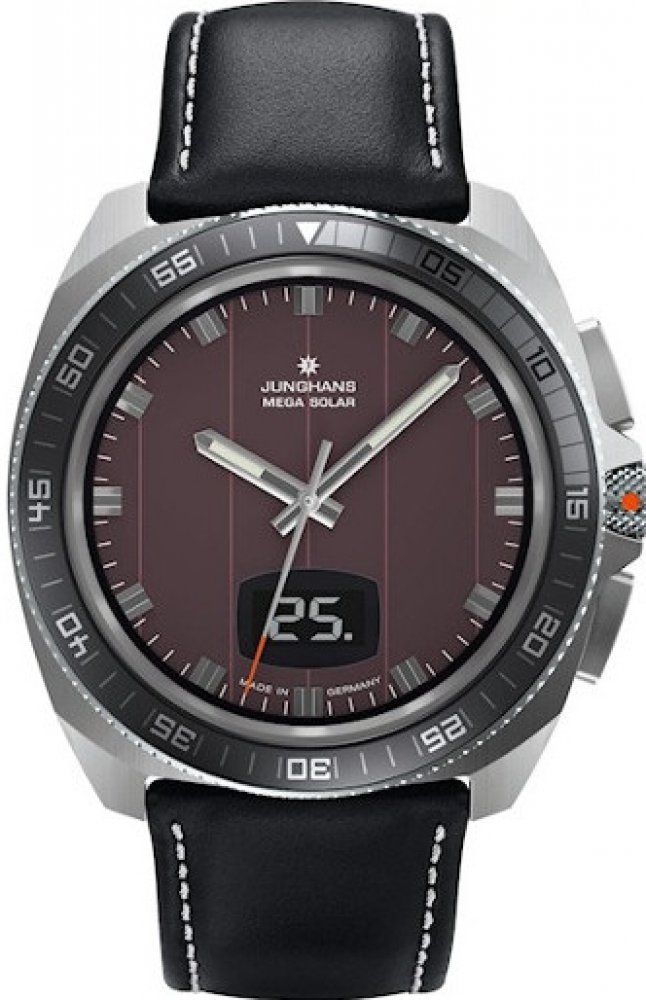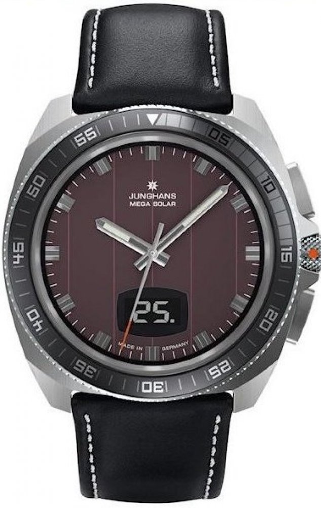 Junghans 1972 Mega Solar model 056/4210, jsou pánské sportovní kombinované (analogové a digitální zobrazení času, data a ostatních funkcí) rádiem řízené hodinky na solární pohon, pouzdro hodinek z nerezové oceli, černý kožený řemínek s bílým prošitím zakončený klasickou ocelovou sponou, safírové sklíčko, frézovaná otočná luneta, černý ciferník se stříbrnými luminiscenčními ručičkami, solární panel...