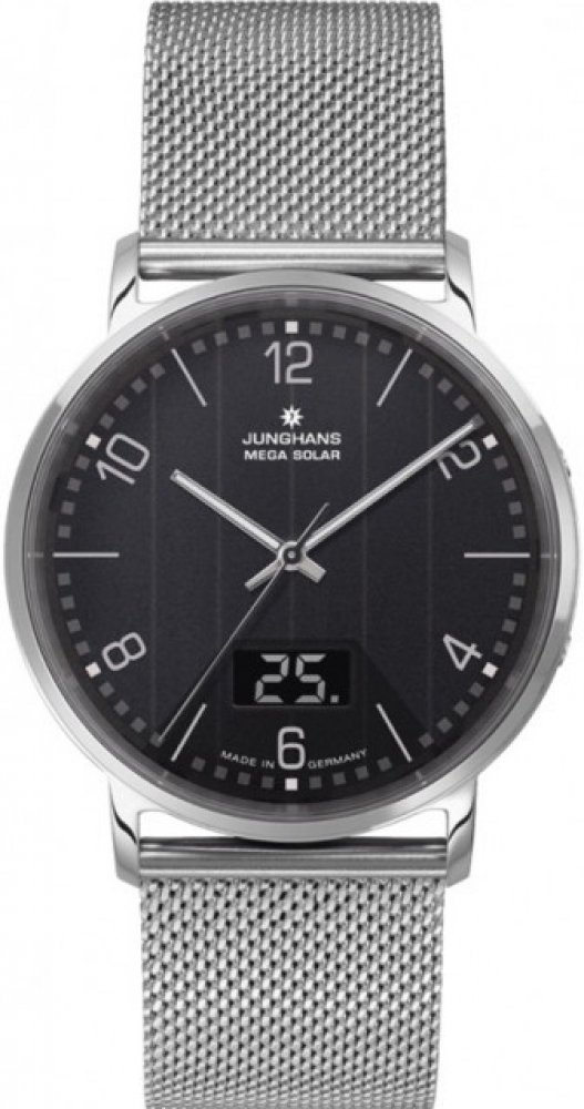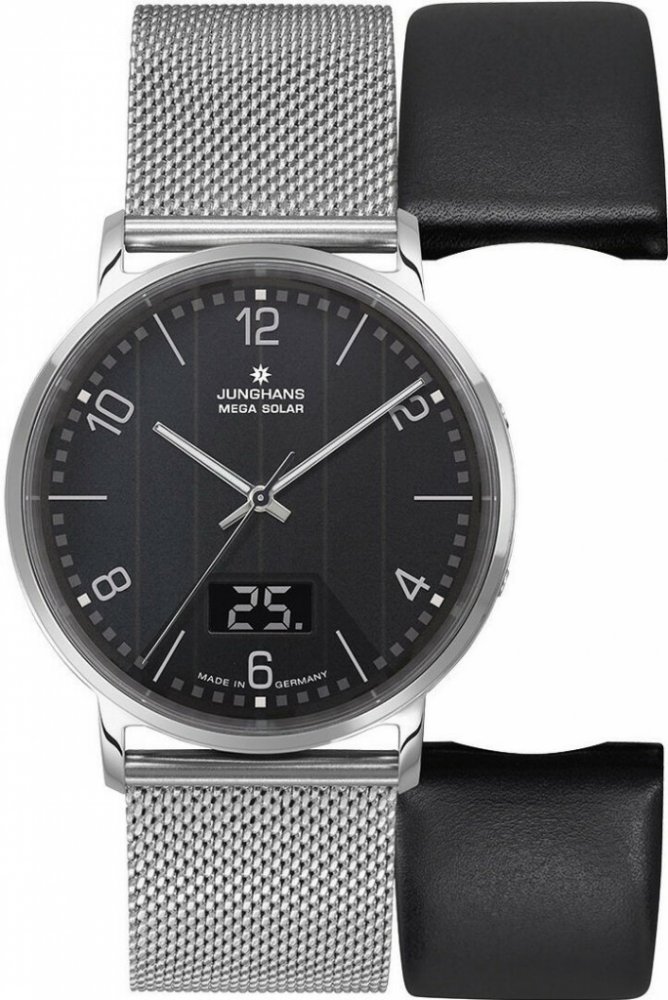 Pánské moderní kombinované (analogové a digitální zobrazení času, data a ostatních funkcí) rádiem řízené hodinky na solární pohon Junghans Milano Mega Solar model 056/4628.44