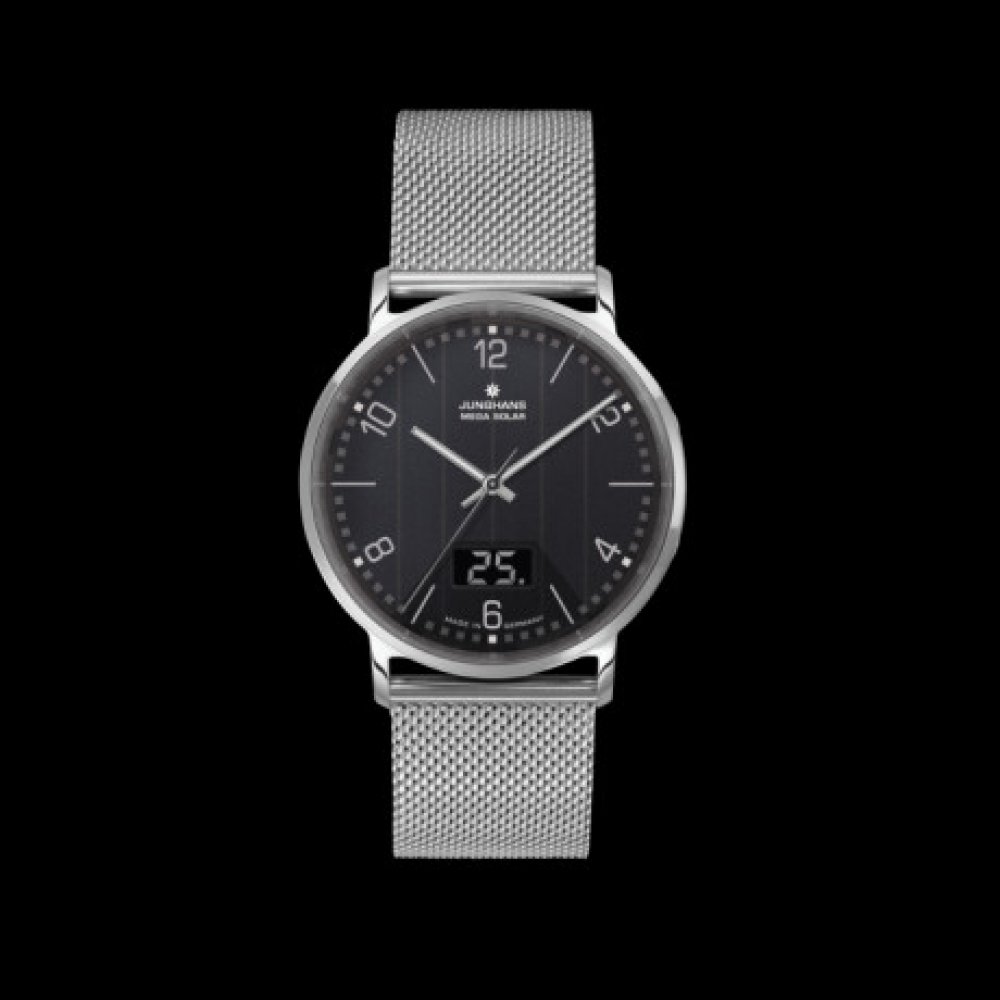 Pouzdro hodinek z leštěné nerezové oceli, tah tzv. milánského typu z nerezové oceli s bezpečnostní sponou gravírovanou logem Junghans, safírové sklíčko, černý číselník se stříbrnými číslicemi a luminiscenčními ručičkami, solá...