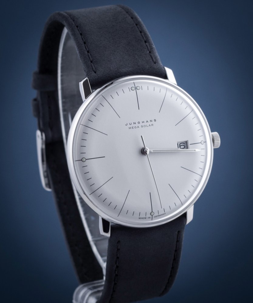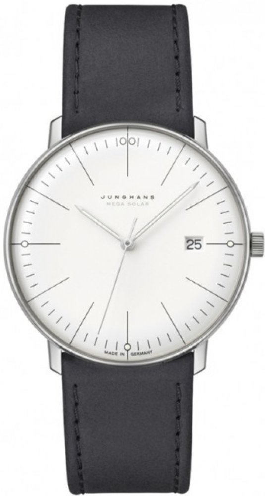Junghans Max Bill MEGA Solar je moderní reminiscence hodinek vyráběných firmou Junghans v 60. letech 20. století jako pocta slavnému švýcarskému architektovi Maxi Billovi. Tyto elegantní hodinky na koženém řemenu jsou poháněny quartzovým strojkem J101.85. Jedná se o multi-frekvenční rádiem řízený quartzový strojek s funkcí zobrazení data a solárním napájením. Synchronizace času funguje všude na světě díky rádiovým stanicím s dlouhovlnným časovým signálem DCF 77 (Evropa), WWVB (USA), JJY40 (Japonsko), JJY60 (Asie). Synchronizace času hodinek a vysílače probíhá jednou denně. Hodinky dosahují vysoké přesnosti i když se zrovna nacházíte mimo příjem signálu (-/+ 8 vteřin / rok). Seřízení času je možné také pomocí mobilního telefonu díky aplikaci Junghans MEGA App, která je dostupná pro Android a iOS. Tento strojek disponuje funkcí věčného kalendáře bez nutnosti korekce až do roku 2400, a to dokonce i bez příjmu rádiového signálu. Zajímavostí je, že vteřinová ručka vykoná dva skoky za vteřinu a minutová ručka se pohybuje skokově s každou minutou. Titanové pouzdro má průměr 38 mm a výšku 9 mm. Matný bílý číselník je kryt konvexním safírovým sklem, které je opatřeno oboustrannou antireflexní vrstvou. Ručky mají luminiscenční nátěr. Hodinky mají voděodolnost 5 ATM.