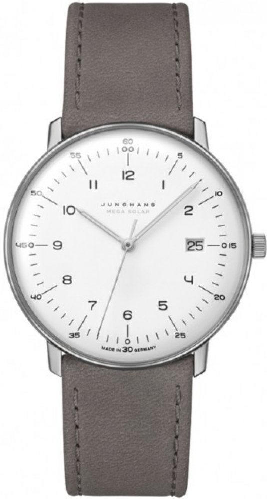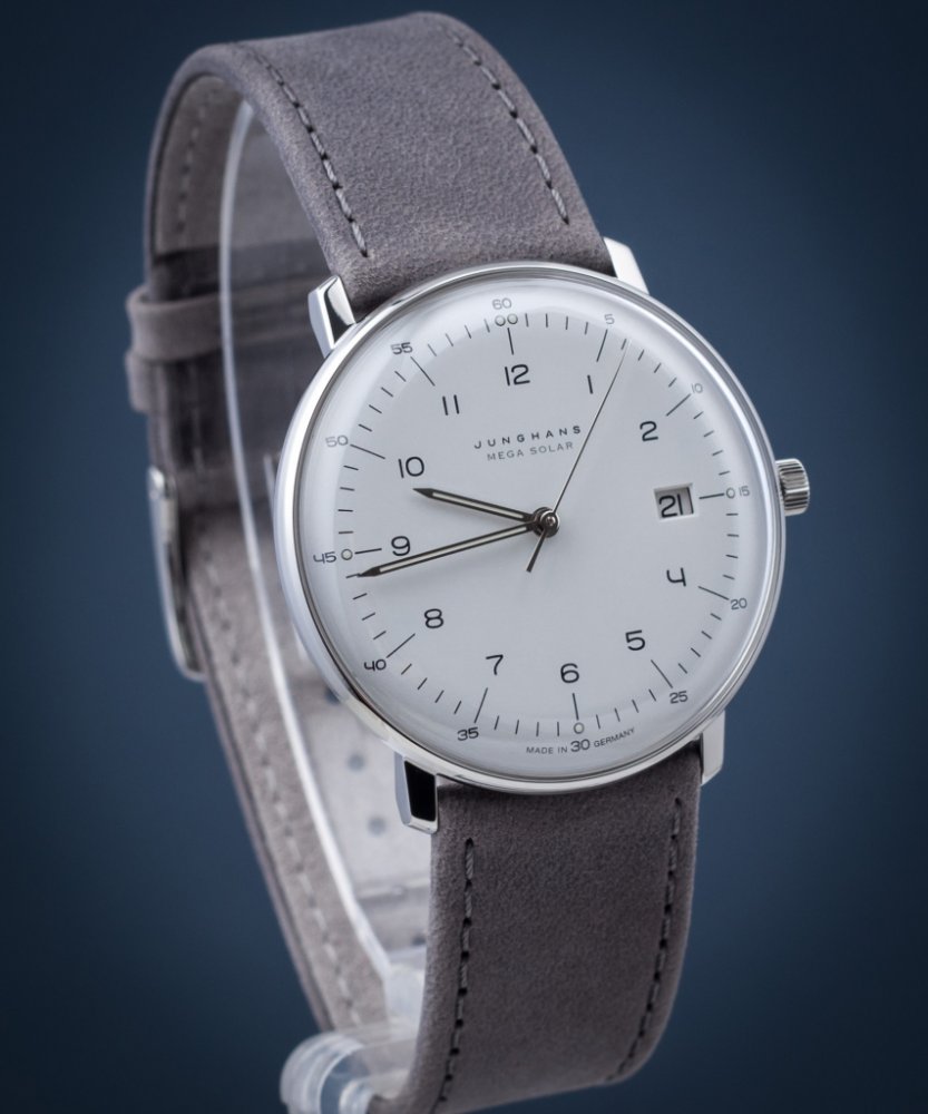 Junghans Max Bill MEGA Solar je moderní reminiscence hodinek vyráběných firmou Junghans v 60. letech 20. století jako pocta slavnému švýcarskému architektovi Maxi Billovi. Tyto elegantní hodinky na koženém řemenu jsou poháněny quartzovým strojkem J101.85. Jedná se o multi-frekvenční rádiem řízený quartzový strojek s funkcí zobrazení data a solárním napájením. Synchronizace času funguje všude na světě díky rádiovým stanicím s dlouhovlnným časovým signálem DCF 77 (Evropa), WWVB (USA), JJY40 (Japonsko), JJY60 (Asie). Synchronizace času hodinek a vysílače probíhá jednou denně. Hodinky dosahují vysoké přesnosti i když se zrovna nacházíte mimo příjem signálu (-/+ 8 vteřin / rok). Seřízení času je možné také pomocí mobilního telefonu díky aplikaci Junghans MEGA App, která je dostupná pro Android a iOS. Tento strojek disponuje funkcí věčného kalendáře bez nutnosti korekce až do roku 2400, a to dokonce i bez příjmu rádiového signálu. Zajímavostí je, že vteřinová ručka vykoná dva skoky za vteřinu a minutová ručka se pohybuje skokově s každou minutou. Titanové pouzdro má průměr 38 mm a výšku 9 mm. Matný bílý číselník je kryt konvexním safírovým sklem, které je opatřeno oboustrannou antireflexní vrstvou. Ručky mají luminiscenční nátěr. Hodinky mají voděodolnost 5 ATM.