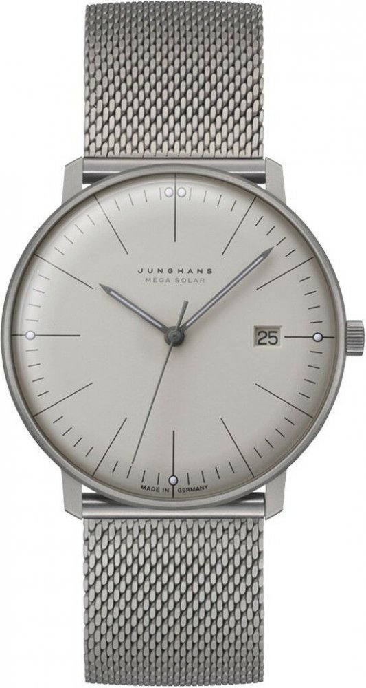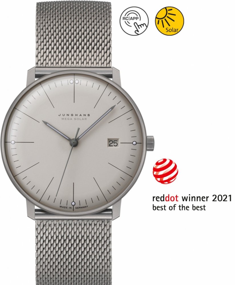 Junghans Max Bill MEGA Solar je moderní reminiscence hodinek vyráběných firmou Junghans v 60. letech 20. století jako pocta slavnému švýcarskému architektovi Maxi Billovi. Tyto elegantní hodinky s titanovým náramkem jsou poháněny quartzovým strojkem J101.85. Jedná se o multi-frekvenční rádiem řízený quartzový strojek s funkcí zobrazení data a solárním napájením. Synchronizace času funguje všude na světě díky rádiovým stanicím s dlouhovlnným časovým signálem DCF 77 (Evropa), WWVB (USA), JJY40 (Japonsko), JJY60 (Asie). Synchronizace času hodinek a vysílače probíhá jednou denně. Hodinky dosahují vysoké přesnosti i když se zrovna nacházíte mimo příjem signálu (-/+ 8 vteřin / rok). Seřízení času je možné také pomocí mobilního telefonu díky aplikaci Junghans MEGA App, která je dostupná pro Android a iOS. Tento strojek disponuje funkcí věčného kalendáře bez nutnosti korekce až do roku 2400, a to dokonce i bez příjmu rádiového signálu. Zajímavostí je, že vteřinová ručka vykoná dva skoky za vteřinu a minutová ručka se pohybuje skokově s každou minutou. Titanové pouzdro má průměr 38 mm a výšku 9 mm. Matný šedý číselník je kryt konvexním safírovým sklem, které je opatřeno oboustrannou antireflexní vrstvou. Ručky mají luminiscenční nátěr. Hodinky mají voděodolnost 5 ATM.