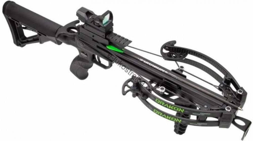 Součástí kuše je holografický zaměřovač, 3 karbonové šípy a vosk pro mazání tětivy a kolejnic.