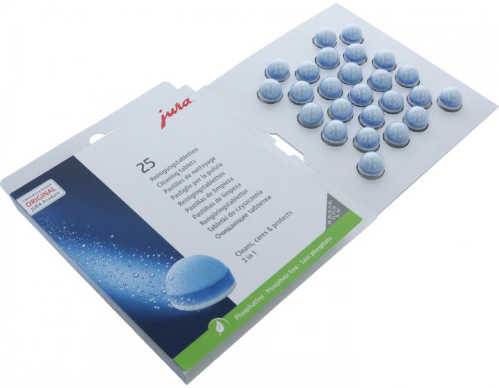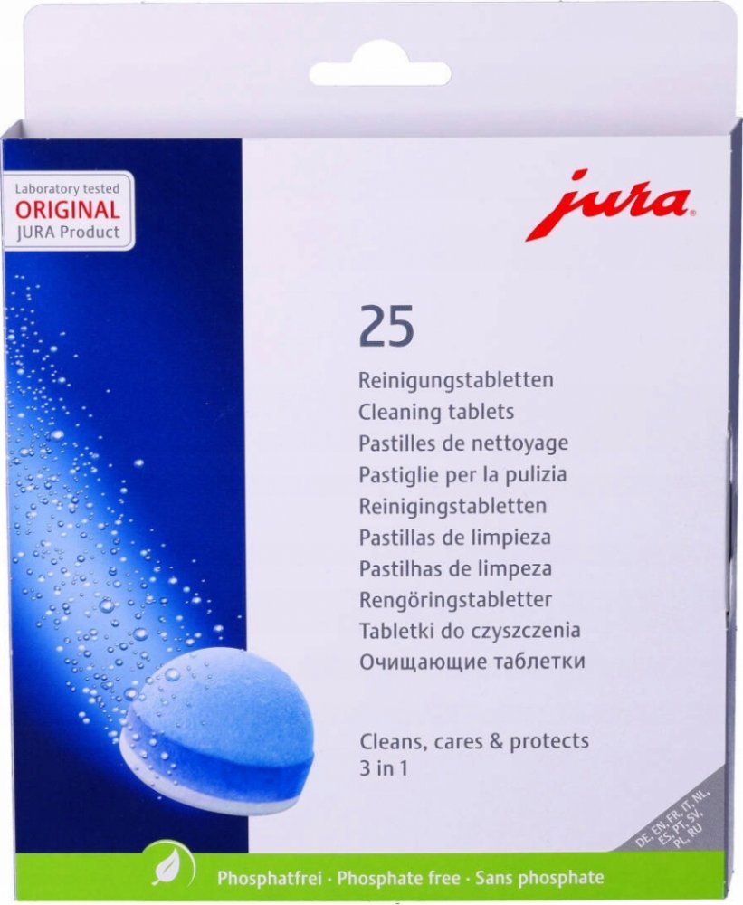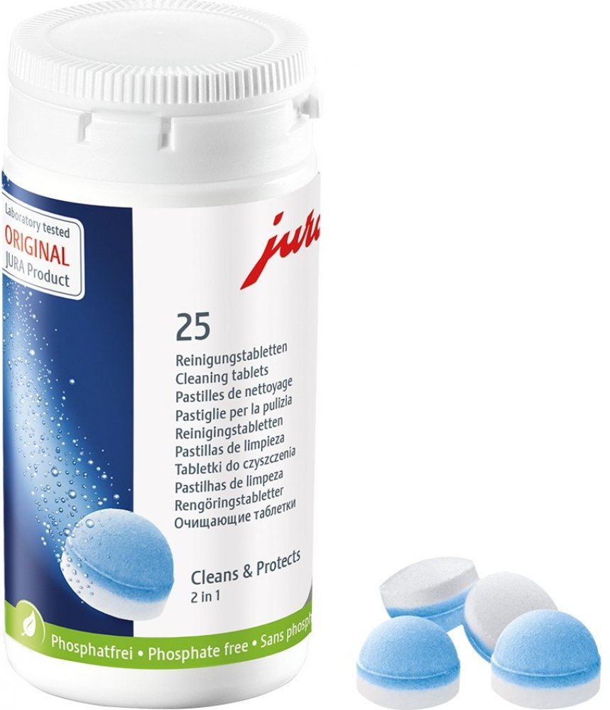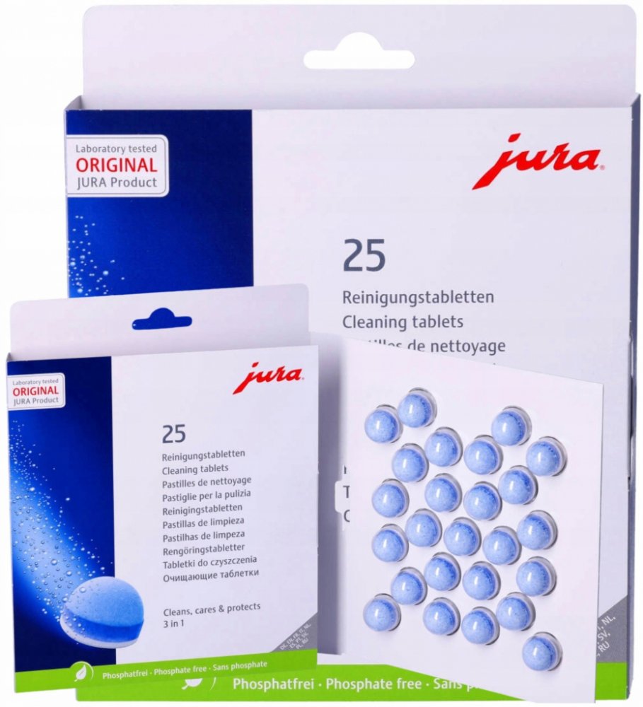 Originální čisticí tablety JURA, milionkrát vyzkoušené a testované, jsou neustále optimalizovány a vylepšovány naším laboratorním týmem. Nová 3fázová čisticí tableta je inovativním výsledkem intenzivního výzkumu. Nově nabízí ještě lepší výsledky díky dodatečné ochranné fázi, která poskytuje trvalou ochranu proti usazování minerálů. Použití tablet je však stále stejně snadné.