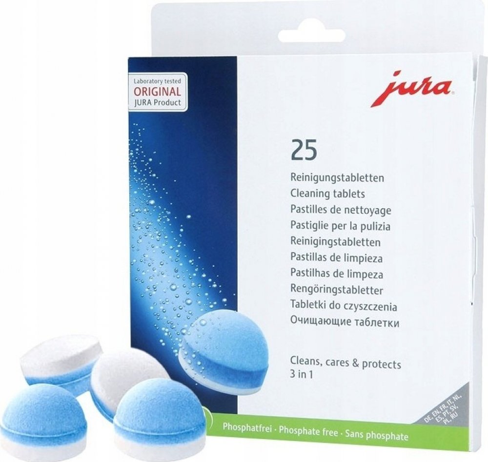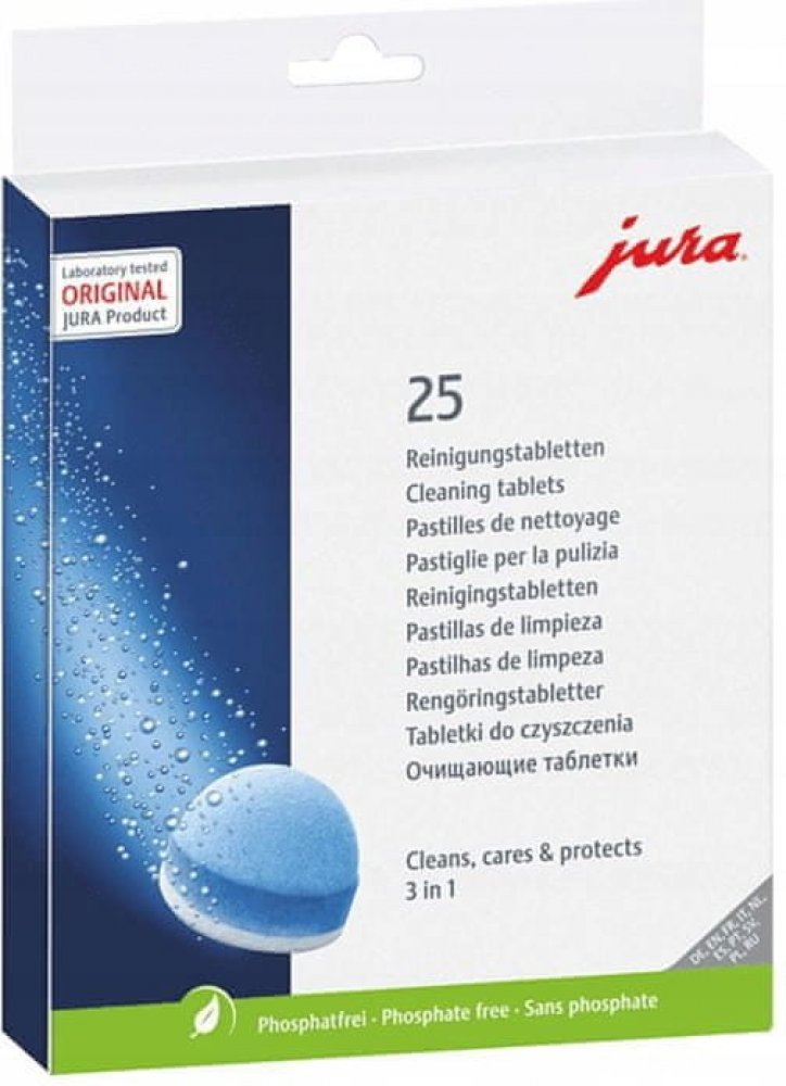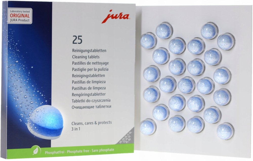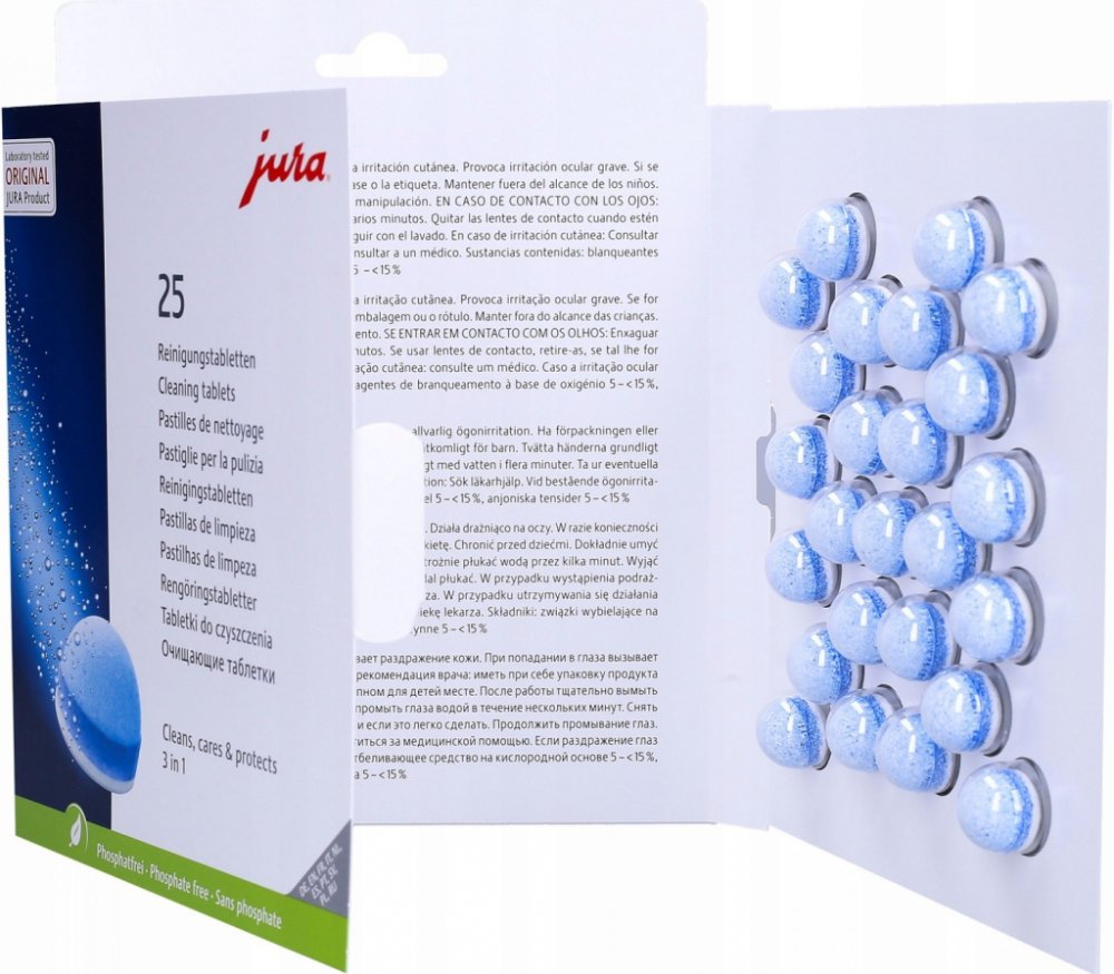 Originální čisticí tablety JURA, milionkrát vyzkoušené a testované, jsou neustále optimalizovány a vylepšovány naším laboratorním týmem. Nová 3fázová čisticí tableta je inovativním výsledkem intenzivního výzkumu. Nově nabízí ještě lepší výsledky díky dodatečné ochranné fázi, která poskytuje trvalou ochranu proti usazování minerálů. Použití tablet je však stále stejně snadné.