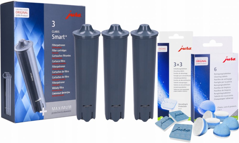 ORIGINÁLNÍ SADA PRO KÁVOVARY JURA : ODVÁPŇOVACÍ TABLETY 9 KS + ČISTICÍ TABLETY 6 KS + 3x FILTR CLARIS SMART+