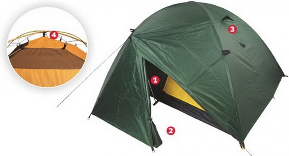 Vnitřní stan je pevně spojen s podlahou. Na pruty konstrukce je zavěšen pomocí napínacích šňůr a háčků. Ve vrcholu vnitřního stanu je větrací otvor kry...