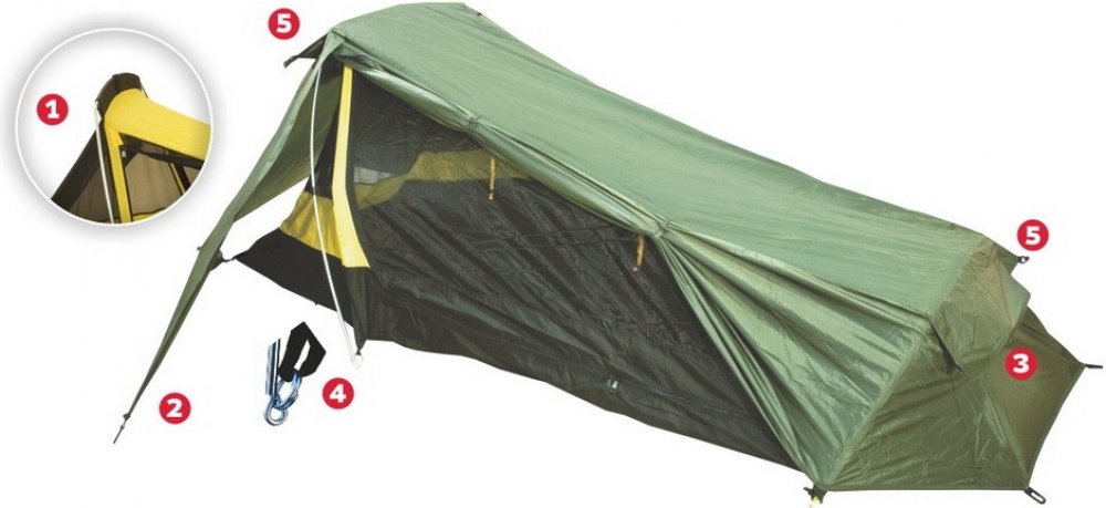 Popis: 1. Vnitřní stan je zavěšen na rukávech. 2. Malá předsíň vhodná na odložení věcí mimo vnitřní stan . 3. Osvědčené kryté větrání. 4. Ukotvení rohů trnem do dutého konce prutu. 5. Velké množství poutek pro lepší vypnutí stanu.