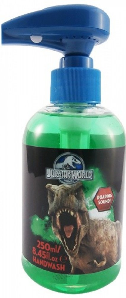 Dětské tekuté mýdlo se zvuky dinosaurů z filmu Jurský Park - Jurský Svět. Po dotknutí se horního tlačítka mýdlo vydává řev dinosaurů. Dopřejte svým dětem zábavné mytí rukou s obávanými dinosaury. Složení mýdla je přizpůsobeno pro jemnou dětskou pokožku.