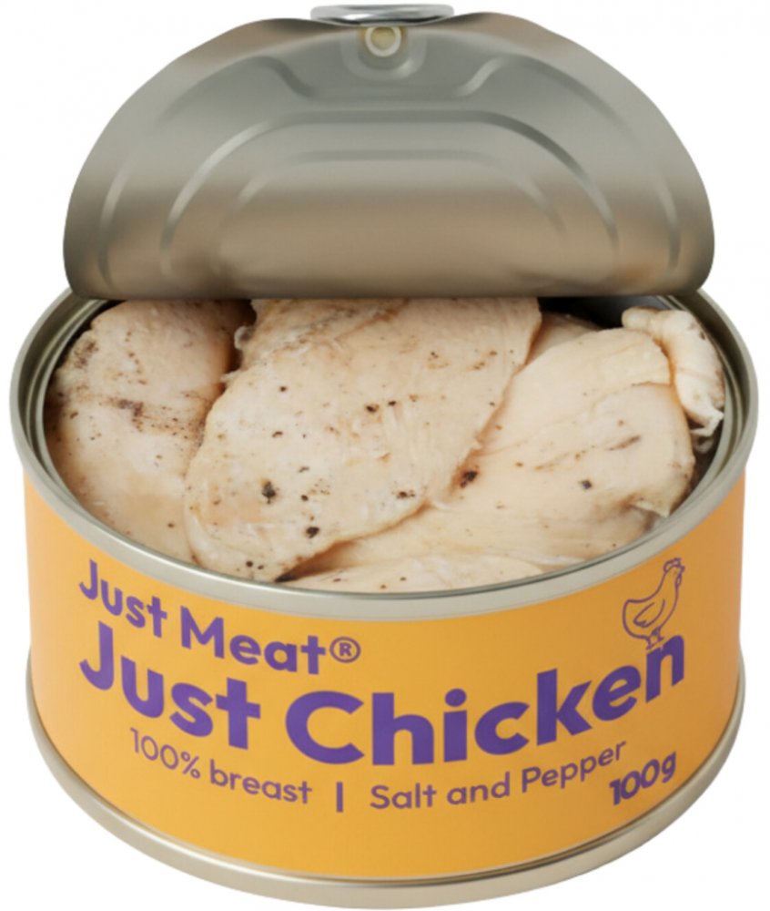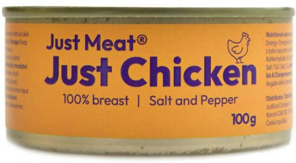 Konzerva Just Meat Just ChickenSalt and pepper, 100 gJust Meat Kuřecí prsa se solí a pepřem je hotové kuřecí maso určené k okamžité konzumaci, vyrobené z 98 % libového kuřecího masa pocházejícího z ověřených slovenských chovů. Maso je dochucené pouze mořskou solí a černým pepřem, bez přidaných konzervantů, zahušťovadel nebo dochucovacích směsí. Díky šetrnému tepelnému zpracování si zachovává přiro...