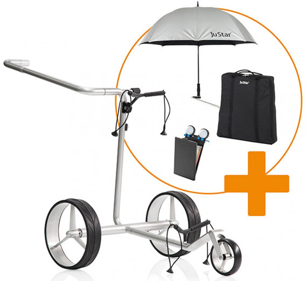 Luxusní elektrický golfový vozík s karbonovým rámem ve stříbrném provedení + taška na vozík + držák skórkarty + deštník + dálkové ovládání.Zaručuje mimořádnou stabilitu a vynikající jízdní vlastnosti díky 2 výkonným motorům.Jednoduchá obsluha s plynulou regulací rychlosti.Výškově nastavitelná rukojeť.Elektronická sjezdová brzda.Automatická přednastavená vzdálenost (10-20-30m).Snadno rozebíratelný, složená velikost: 65 x 60 x 10cmBezpečné a snadné upevnění golfového bagu.Vysoká nosnost.Držák na deštník JuCad.Vysoce výkonná lithiová baterie na 45 jamek, včetně nabíječky.Váha: 5.5 kg. -