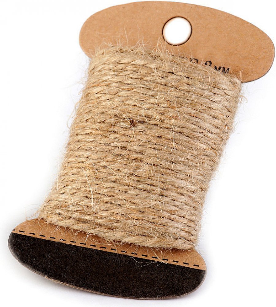 Přírodní jutový provázek je pevný a spletený ze tří tenčích šňůr. Je skvělým pomocníkem ve floristice a jiných dekoračních technikách. Provázky jsou navinuty na papírových kartách s dírkou, můžete je pohodlně zavěsit na prodejní stojan.