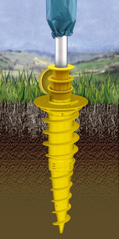 Dvojitý zemní šroub - dvoudílný plastový zemní šroub s redukcí pro zahradní slunečník. V zemi předvrtáte vrtačkou otvor, do kterého "zašroubujete" zemní šroub. Do něj potom zasunete nosnou tyč sušáku. Tento model zemního šroubu umožňuje zasunutí tyče o průměru 40 - 55 mm. Šroub má víčko, které po vysunutí sušáku šroub uzavře, takže do něj nezatéká voda.