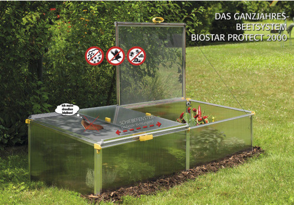 Pařeniště JUWEL BIOSTAR PROTECT 2000 je skvělou volbou pro vaši zahradu. Větrání zajišťuje posuvné okno se zabudovanou ochranou proti škůdcům. Polykarbonátové okno lze v létě odstranit a okenní síť chrání proti slunci, krupobití a škůdcům.