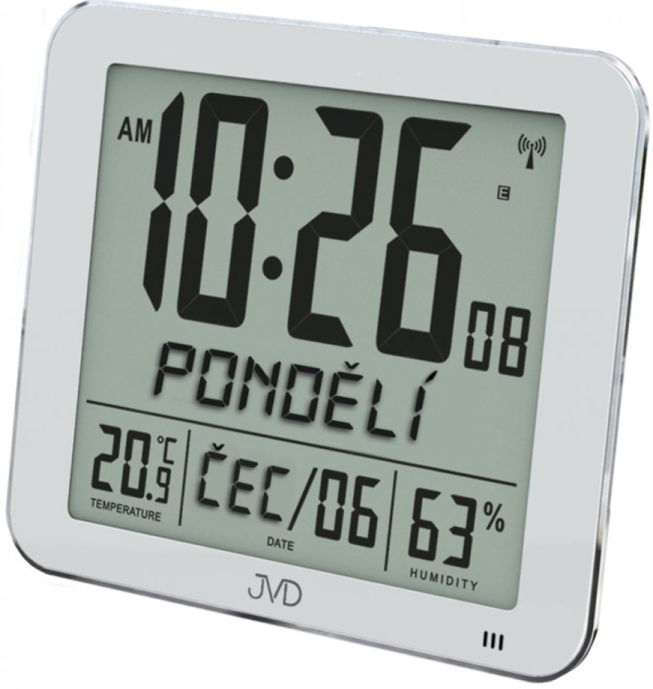 Funkce: měření vnitřní teploty a vlhkosti, datum, měsíc, den v týdnu, budík, zobrazení 12/24 formátu, 10 jazyků (CZ).