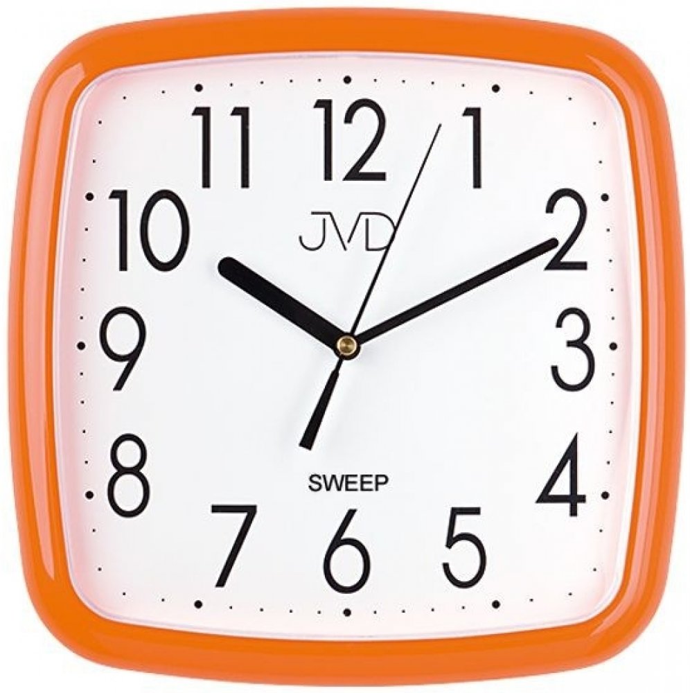 Nástěnné hodiny JVD HP615.7: tyto hranaté nástěnné hodiny s oranžovým lemováním jsou vyrobeny z plastu a bezesporu zaujmou svou jednoduchostí a zároveň originalitou. Čas je zobrazován pomocí dvanácti arabských číslic černé barvy. Tyto nástěnné hodiny JVD jsou poháněny quartzovým (bateriovým) strojkem s plynulým (tichým) chodem. Rozměry pouzdra vybraných hodin značky JVD jsou 250 x 250 mm.