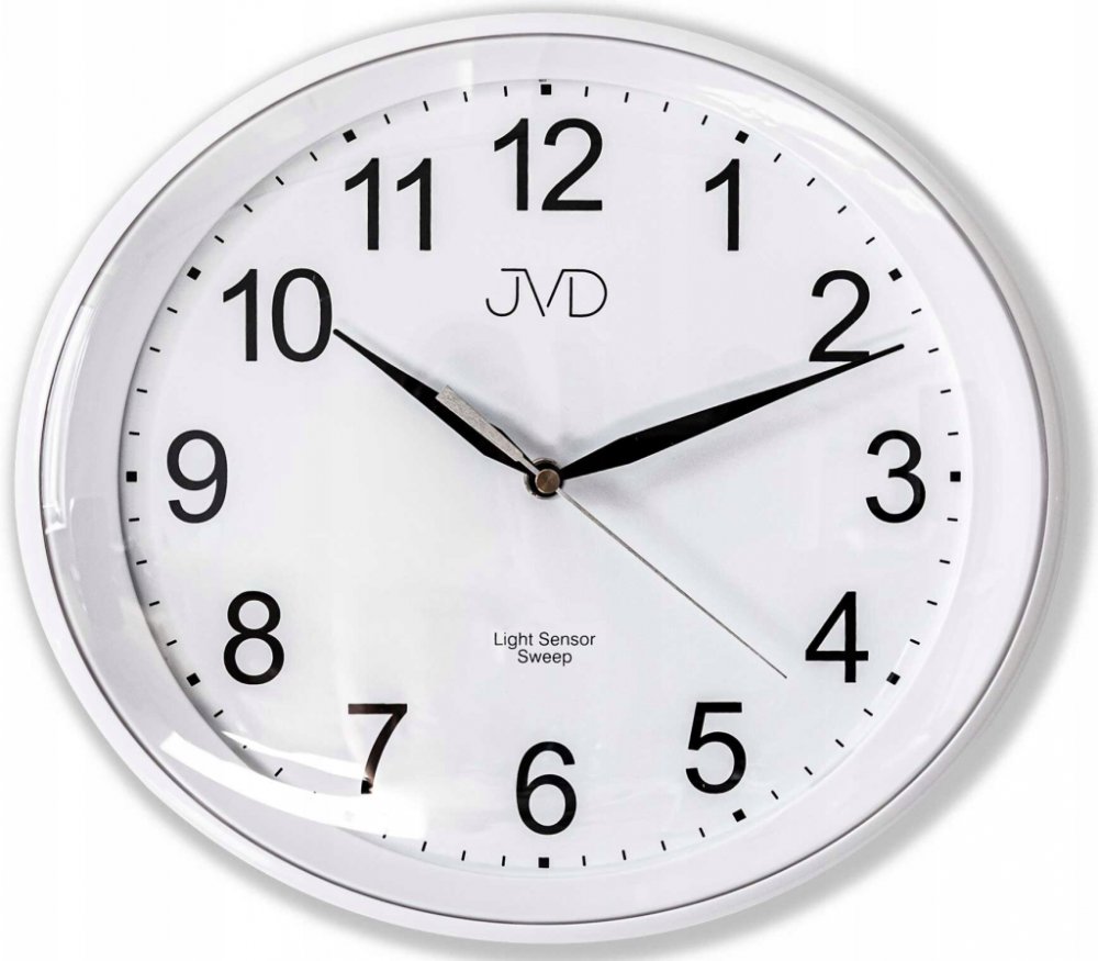 Nástěnné hodiny mají pouzdro vyrobené z plastu bílé barvy. Čas na bílém číselníku zobrazuje 12 výrazných arabských číslic, které přispívají k velmi dobré čitelnosti času i z větší dálky a díky senzoru stmívání se hodiny z kolekce JVD Basic po setmění automaticky rozsvítí. Oválné hodiny o rozměru 300 x 270 mm pohání bateriový strojek s tichým (plynulým) chodem.