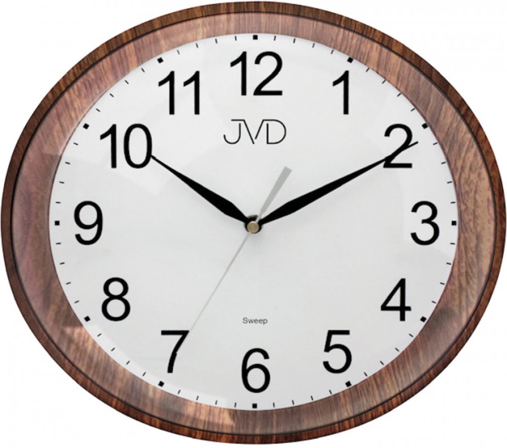 Plastové, nástěnné hodiny JVD HP664.10 Nástěnné hodiny mají pouzdro vyrobené z plastu v imitaci přírodního tmavě hnědého dřeva. Čas na bílém číselníku zobrazuje 12 výrazných arabských číslic, díky kterým jsou hodiny dobře čítelné i z větší dálky. Oválné hodiny s rozměrem 300 x 270 mm jsou poháněny quartzovým (bateriovým) strojkem s plynulým chodem.